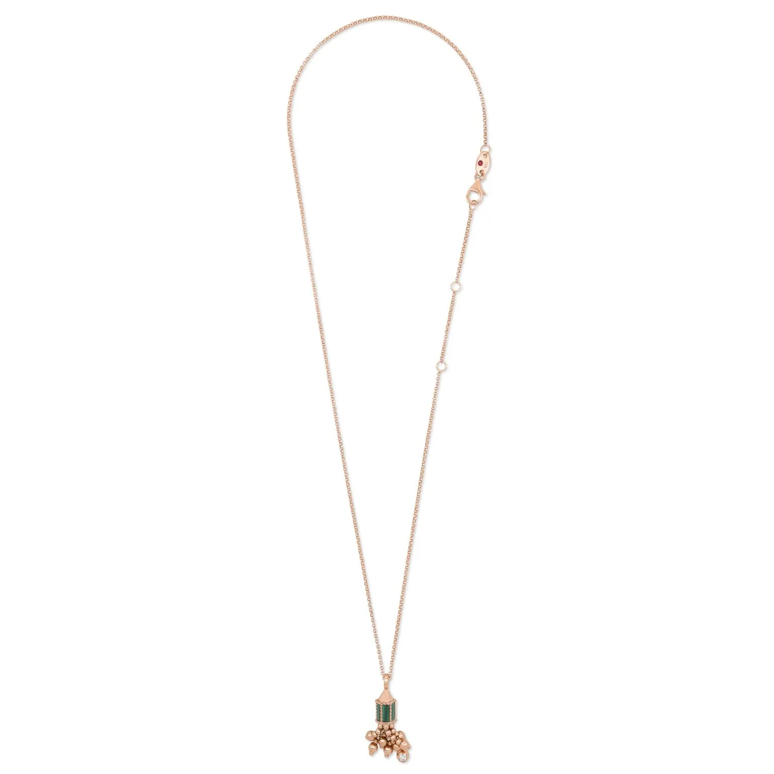 Sodriai žalias malachitas subtiliai pabrėžia šio Roberto Coin Art Deco kolekcijos pakabuko grožį. Sukurtas iš 18 karatų rožinio aukso, jis dekoruotas žėrinčiais briliantais ir elegantišku kutų (tassel) dizainu, suteikiančiu papuošalui lengvumo ir rafinuotos prabangos. Preciziška rankų darbo meistrystė užtikrina kiekvieno kūrinio unikalumą bei autentiškumą.