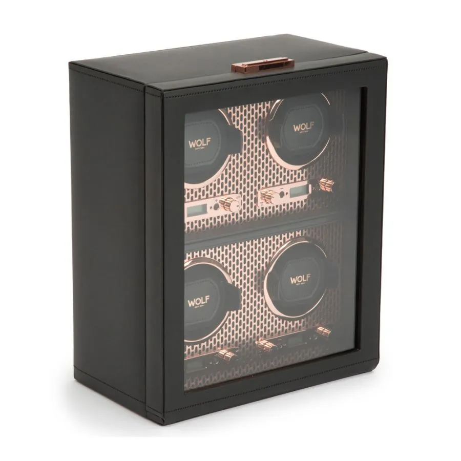 Rafinuotą dizainą papildo mikrosuede interjeras, užrakinamas stiklinis dangtelis, apšviestas LCD ekranas, vario spalvos detalės bei keturi sukimo moduliai, suteikiantys vietos visai laikrodžių kolekcijai. Tai modernios prabangos akcentas, užtikrinantis tiek nepriekaištingą priežiūrą, tiek elegantišką laikrodžių eksponavimą.