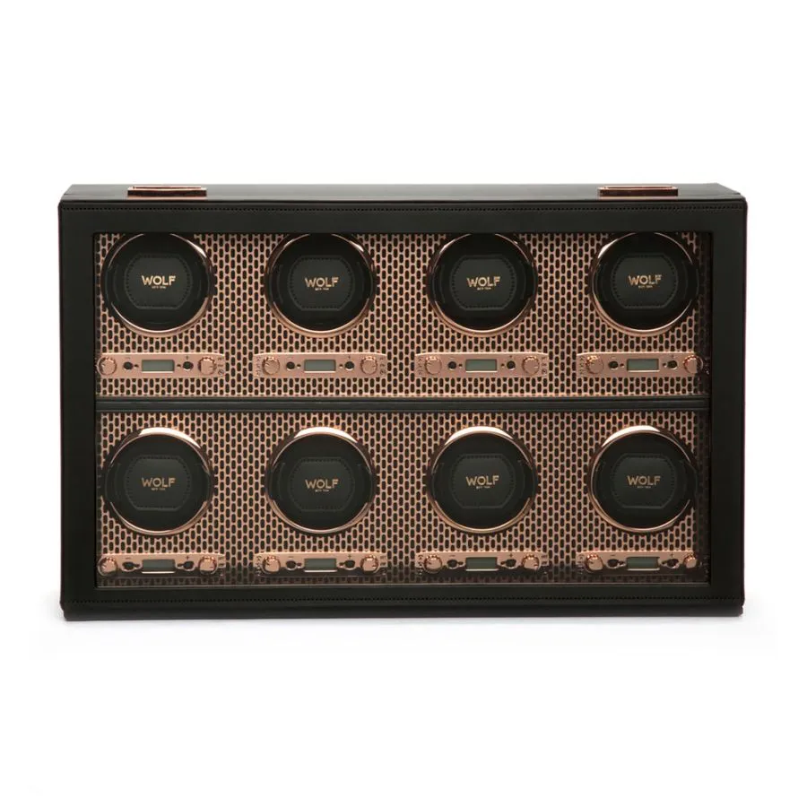 Axis 8 Piece Watch Winder – tai modernios prabangos ir techninio tikslumo įsikūnijimas, sukurtas didesnės laikrodžių kolekcijos priežiūrai. Pagamintas iš variu dengto, lazeriu pjauto perforuoto plieno, šis modelis išsiskiria drąsiu charakteriu, švariomis linijomis ir rafinuota estetika. Patentuota WOLF technologija užtikrina, kad kiekvienas laikrodis bus tiksliai pasuktas pagal nustatytą apsisukimų skaičių, o jų veikimas – nepriekaištingas.