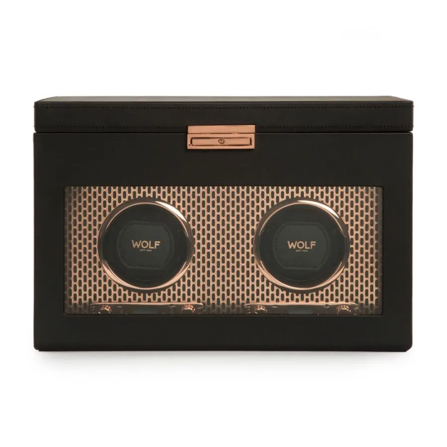 Šiuolaikinė prabanga įgauna naują formą su Axis Double Watch Winder with Storage. Sukurtas iš variu dengto, lazeriu pjauto perforuoto plieno, šis laikrodžių suktukas išsiskiria švariomis linijomis, ryškiu charakteriu ir moderniu dizainu. Integruota patentuota technologija tiksliai skaičiuoja kiekvieną apsisukimą, užtikrindama, kad Jūsų laikrodžiai visada bus nepriekaištingai prižiūrimi.