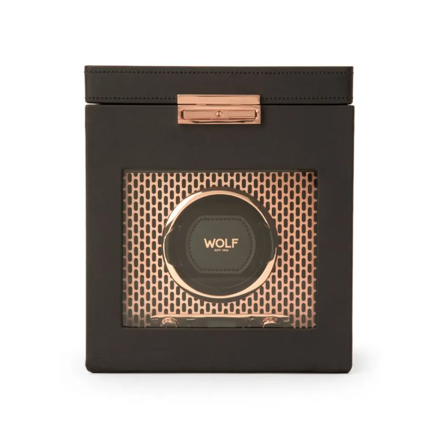 Moderni prabanga ir pažangiausia technologija susijungia Axis Double Watch Winder with Storage modelyje. Pagamintas iš variu dengto, lazeriu pjauto perforuoto plieno, šis suktukas žavi švariomis linijomis, ryškiu charakteriu ir suteikia laikrodžių kolekcijai išskirtinės elegancijos. Mūsų patentuota technologija tiksliai skaičiuoja kiekvieną apsisukimą, užtikrindama nepriekaištingą laikrodžių priežiūrą.