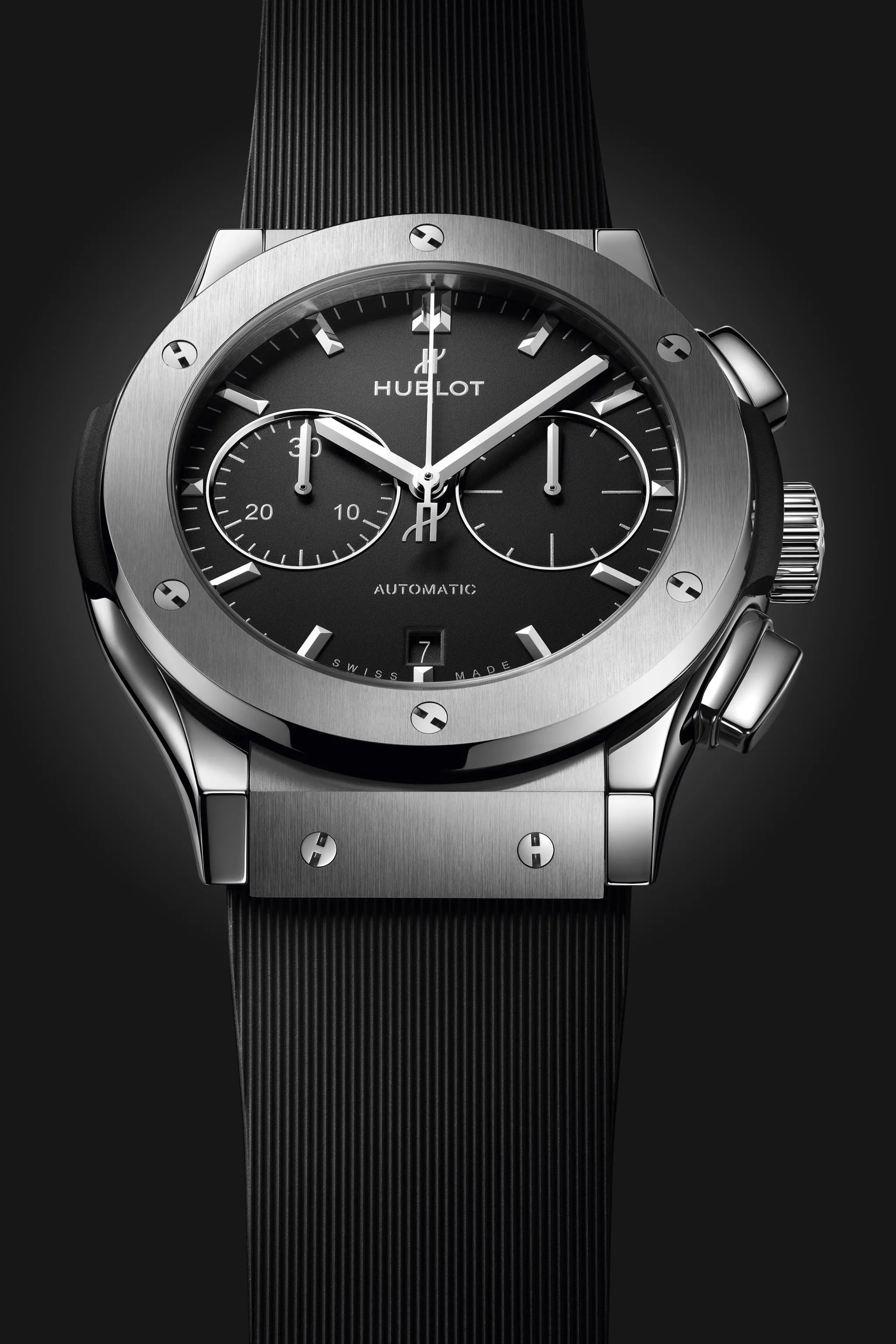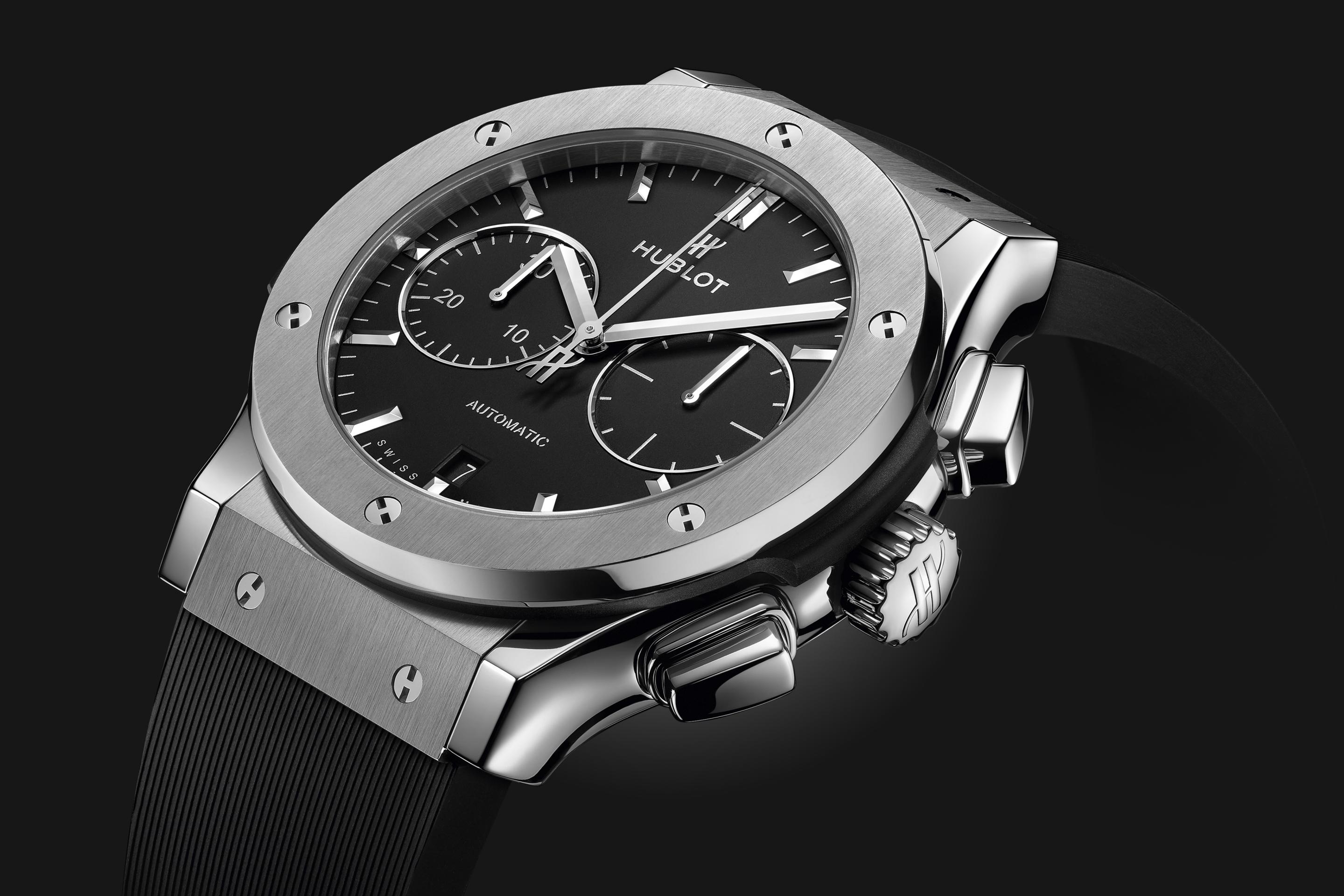 „Hublot“ plačiai naudoja titaną dėl jo išskirtinio lengvumo ir tvirtumo. Ši medžiaga pasižymi neprilygstamu atsparumo ir svorio santykiu, todėl itin vertinama aviacijos ir pažangios inžinerijos srityse. Titanas taip pat išsiskiria atsparumu korozijai ir neutralumu odai, todėl užtikrina maksimalų komfortą dėvint. „Hublot“ naudoja tik aukščiausios kokybės 5 klasės titaną – stipriausią iš visų. Poliruotas jis įgauna subtilų melsvą metalinį atspalvį, suteikiantį laikrodžiui išskirtinę eleganciją ir modernų charakterį.