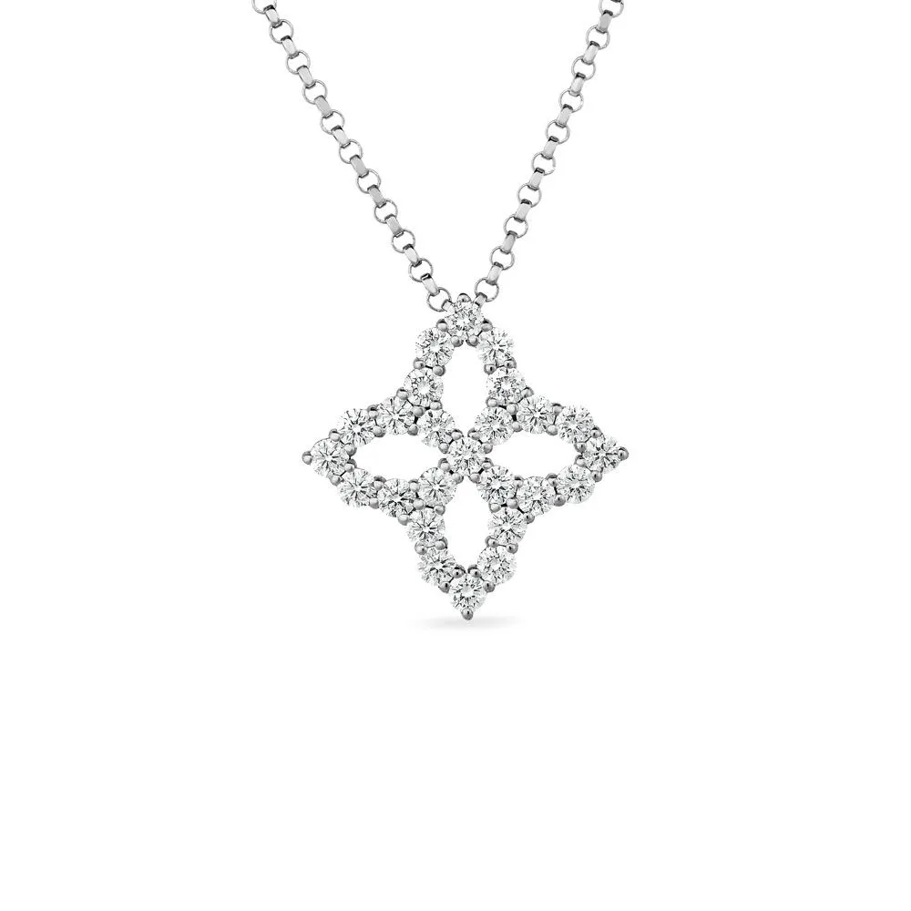 Spindintys deimantai tampa pagrindiniu akcentu šiame Roberto Coin Diamond Princess kolekcijos pakabuke. Sukurtas iš 18 karatų balto aukso, jis spindi subtilia elegancija ir romantišku gėlių motyvu, simbolizuojančiu moteriškumą bei rafinuotą grožį. Papuošalą papildo 18 kt balto aukso grandinėlė su reguliuojamu ilgiu nuo 450 mm iki 420 mm, leidžianti lengvai priderinti prie įvairių įvaizdžių.