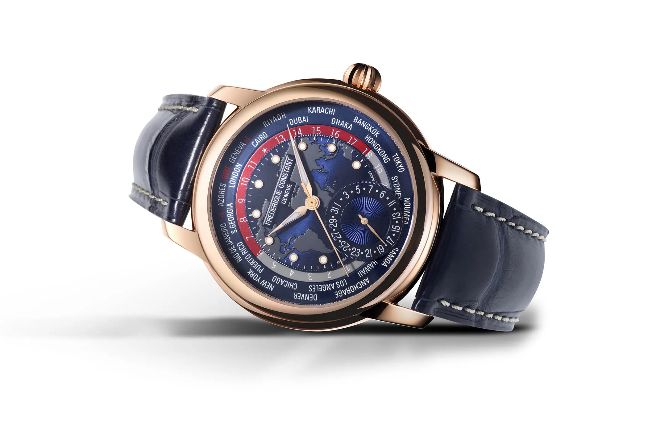 Širdyje plaka Frederique Constant in-house automatinis mechanizmas FC-718, leidžiantis patogiai nustatyti visus pasaulio laikus viena karūnėle – tikra mechaninės inžinerijos pergalė. Laikrodis dėvimas su mėlynu aligatoriaus odos dirželiu su kreminėmis siūlėmis, pabrėžiančiu jo išskirtinumą.