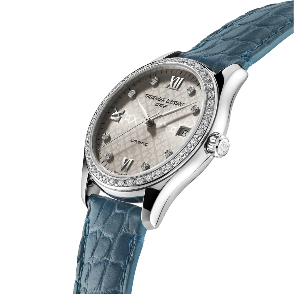 Laikrodį puošia spindintis mėlynas ciferblatas, dekoruotas deimantiniais valandų žymekliais ir subtiliai išdėstytu datų langeliu ties 3 val. pozicija. Poliruotas nerūdijančio plieno korpusas su mėlynos odos dirželiu suteikia laikrodžiui prabangos ir išskirtinumo pojūtį. Viduje veikia automatinis mechanizmas FC-303, užtikrinantis tikslumą, patikimumą ir šveicariškos kokybės ilgaamžiškumą.