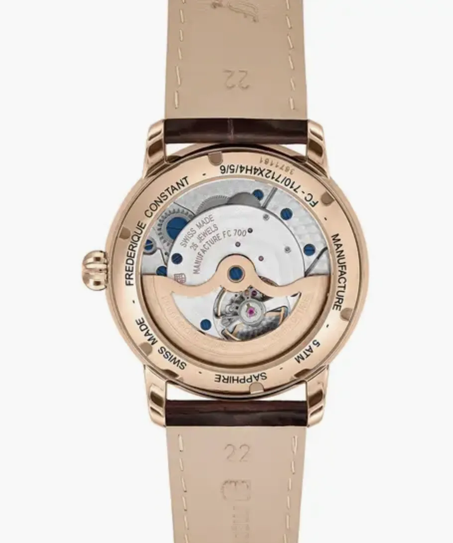 Frederique Constant Manufacture Classic FC-710MC4H4 – tai tikros šveicariškos meistrystės simbolis, sukurtas su išskirtiniu dėmesiu detalėms. Šis laikrodis pasižymi „in-house“ automatinio mechanizmo FC-710 precizika – visiškai Frederique Constant manufaktūroje sukurtu ir surinktu kalibru, atspindinčiu aukščiausius laikrodininkystės standartus.