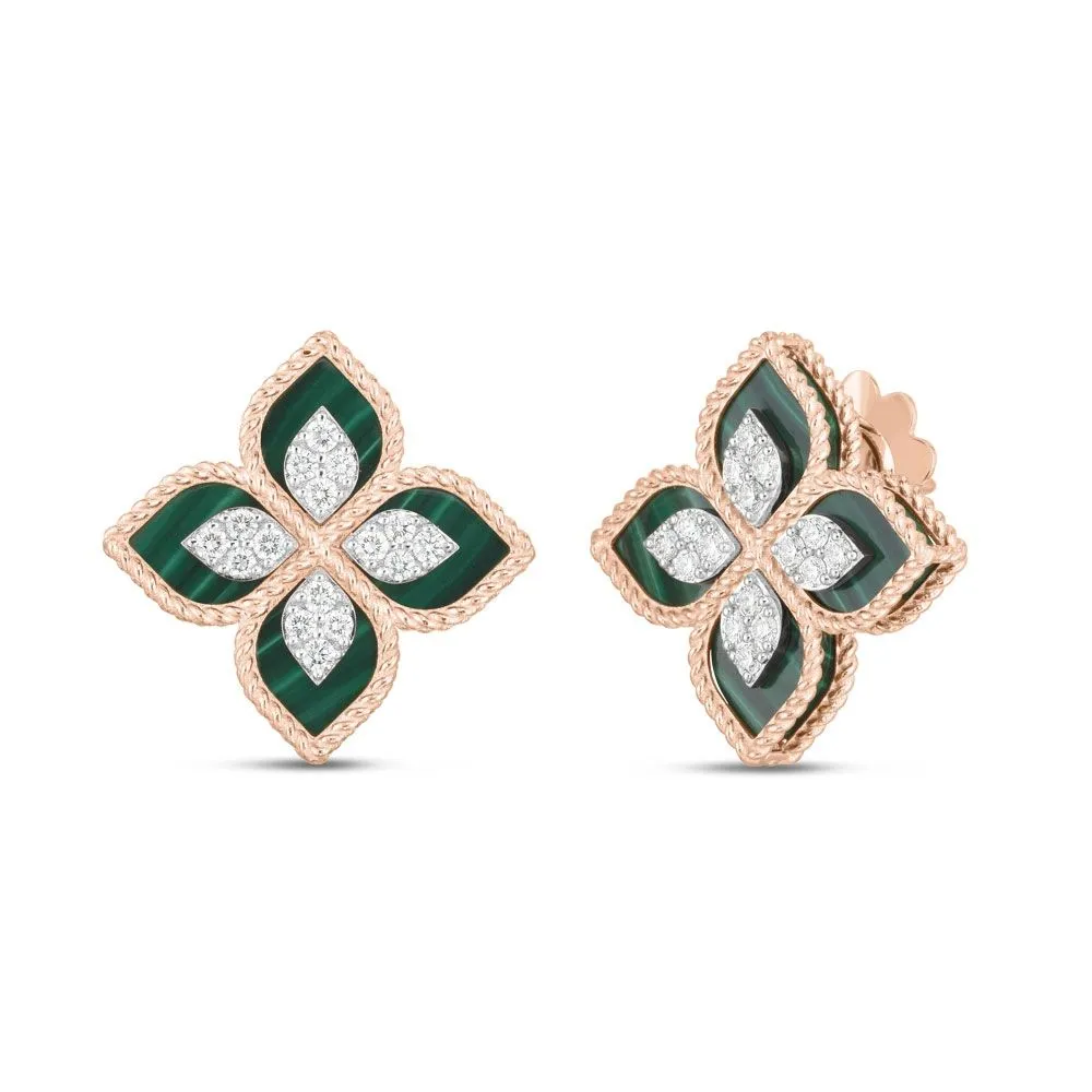 Žaliojo malachito magija atsiskleidžia šiuose įspūdinguose Roberto Coin Princess Flower kolekcijos auskaruose. Sukurti iš 18 karatų rožinio aukso, jie dekoruoti sodriai žaliais malachito akmenimis ir žėrinčiais briliantais. Subtilus gėlių motyvas simbolizuoja moteriškumą, o kruopšti rankų darbo meistrystė paverčia kiekvieną auskarų porą išskirtiniu meno kūriniu.