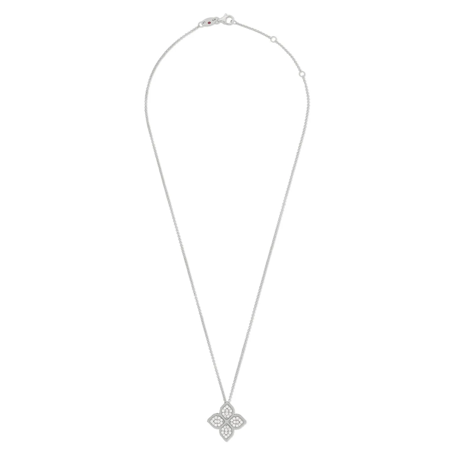 Romantiškas gėlių motyvas ir žėrinčių deimantų švytėjimas susitinka šiame Roberto Coin Princess Flower kolekcijos pakabuke. Sukurtas iš 18 karatų aukso, jis spindi išskirtine elegancija ir subtilia prabanga. Modelis prieinamas balto, geltono ir rožinio aukso versijose, tad kiekviena moteris gali atrasti savo stilių atitinkantį variantą. Pakabukas parduodamas kartu su 18 kt aukso grandinėle, kurios ilgis reguliuojamas nuo 450 mm iki 420 mm.