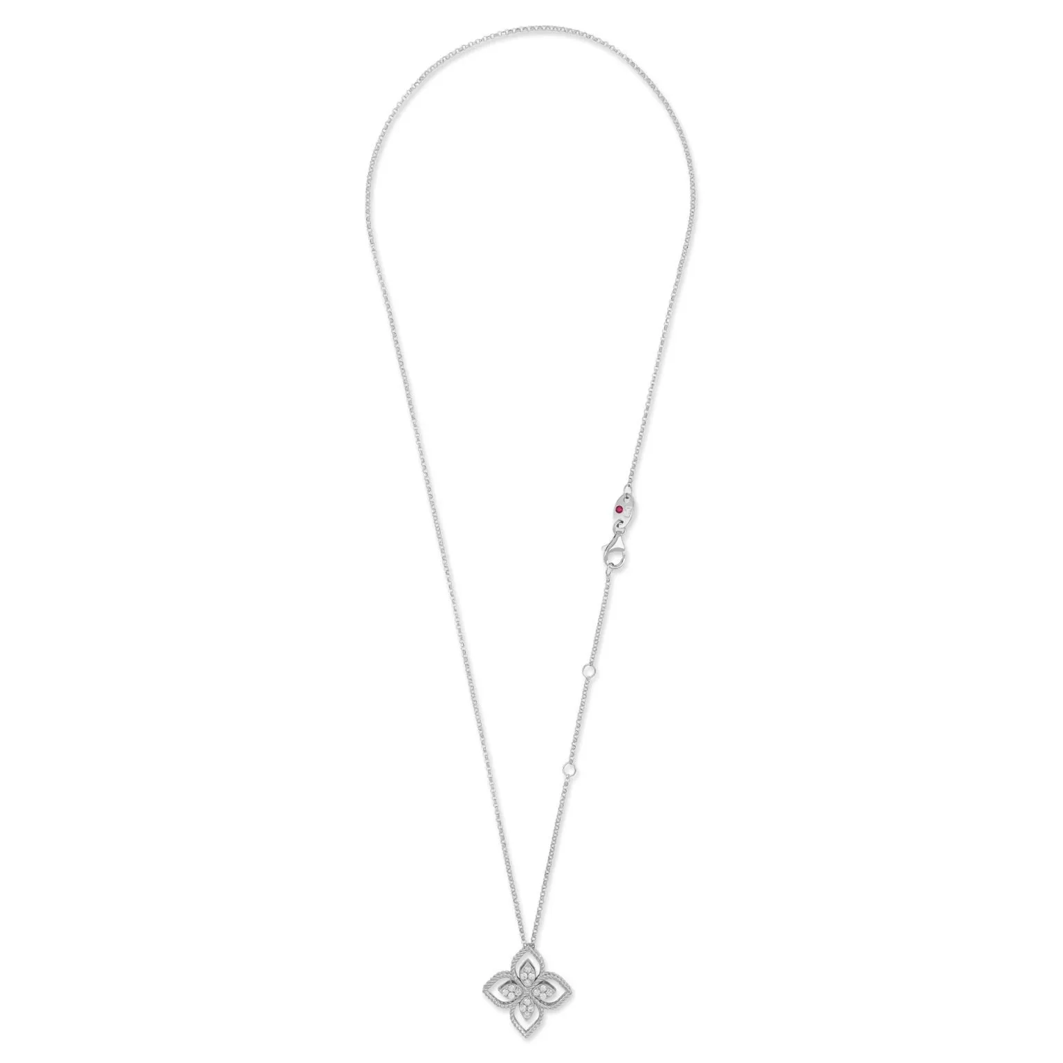 Deimantų spindesys centre suteikia ypatingo žavesio šiam Roberto Coin Princess Flower kolekcijos pakabukui. Sukurtas iš 18 karatų aukso, jis žavi romantišku gėlių motyvu – subtilios prabangos ir moteriškumo simboliu. Modelis prieinamas balto, geltono ir rožinio aukso versijose, todėl kiekviena moteris gali atrasti labiausiai jos stilių atitinkantį variantą. Pakabukas parduodamas kartu su 18 kt aukso grandinėle, kurios ilgis reguliuojamas nuo 450 mm iki 420 mm.