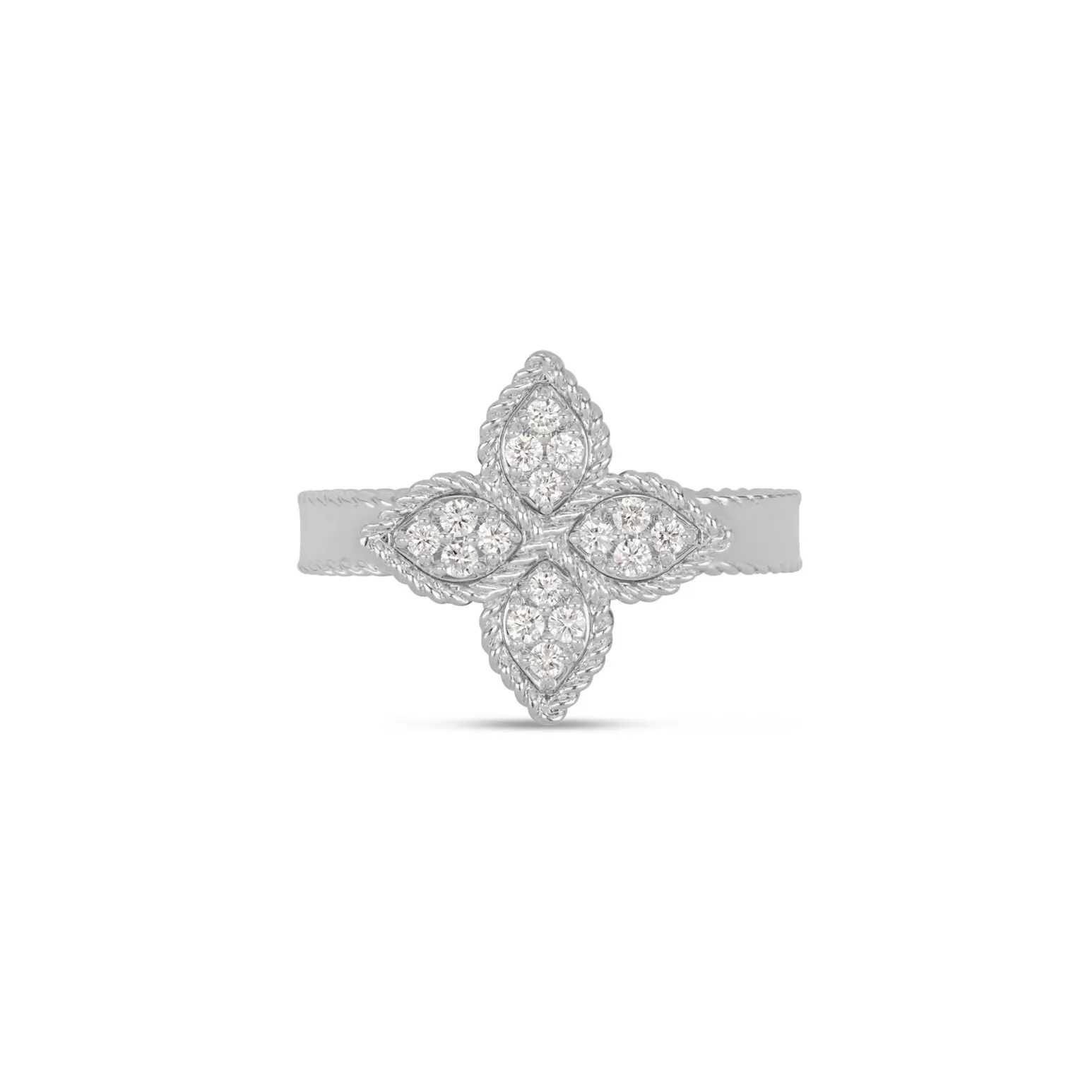 Žėrinčių deimantų švytėjimas suteikia šiam Roberto Coin Princess Flower kolekcijos žiedui ypatingo žavesio. Sukurtas iš 18 karatų aukso, jis puošia ranką subtiliu gėlių motyvu – romantiškos elegancijos ir moteriškumo simboliu. Modelis prieinamas geltono, balto ir rožinio aukso versijose, tad kiekviena moteris gali atrasti savo stilių atitinkantį variantą. Preciziška rankų darbo meistrystė paverčia kiekvieną žiedą unikaliu kūriniu.