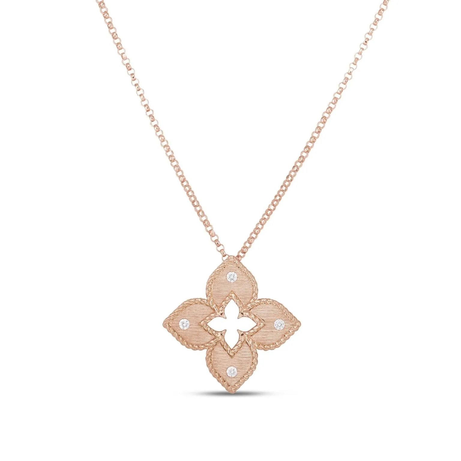 Žėrinčių deimantų švytėjimas suteikia ypatingo spindesio šiam Roberto Coin Venetian Princess kolekcijos pakabukui. Sukurtas iš 18 karatų aukso, jis dekoruotas subtiliu gėlių motyvu – romantiškos elegancijos ir moteriškumo simboliu. Modelis prieinamas balto, geltono ir rožinio aukso versijose, kad kiekviena moteris galėtų atrasti sau artimiausią variantą. Papuošalą papildo 18 kt aukso grandinėlė su reguliuojamu ilgiu nuo 450 mm iki 420 mm.